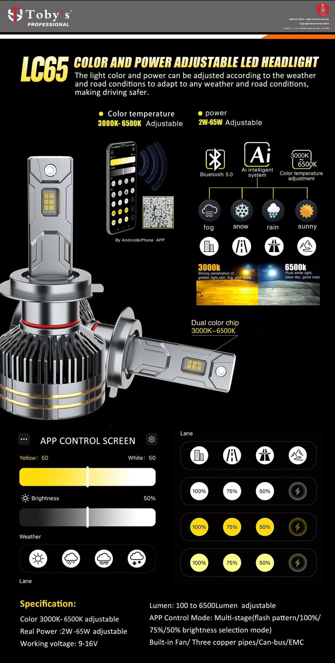 3000K/4300K/6500K Single lamp startup: 55-60W, stable at 40-45W Dual lamp startup: 55-60W, stable at 40-45W APP control only adjusts low beam color temperature; high beam remains white light at 6500K.