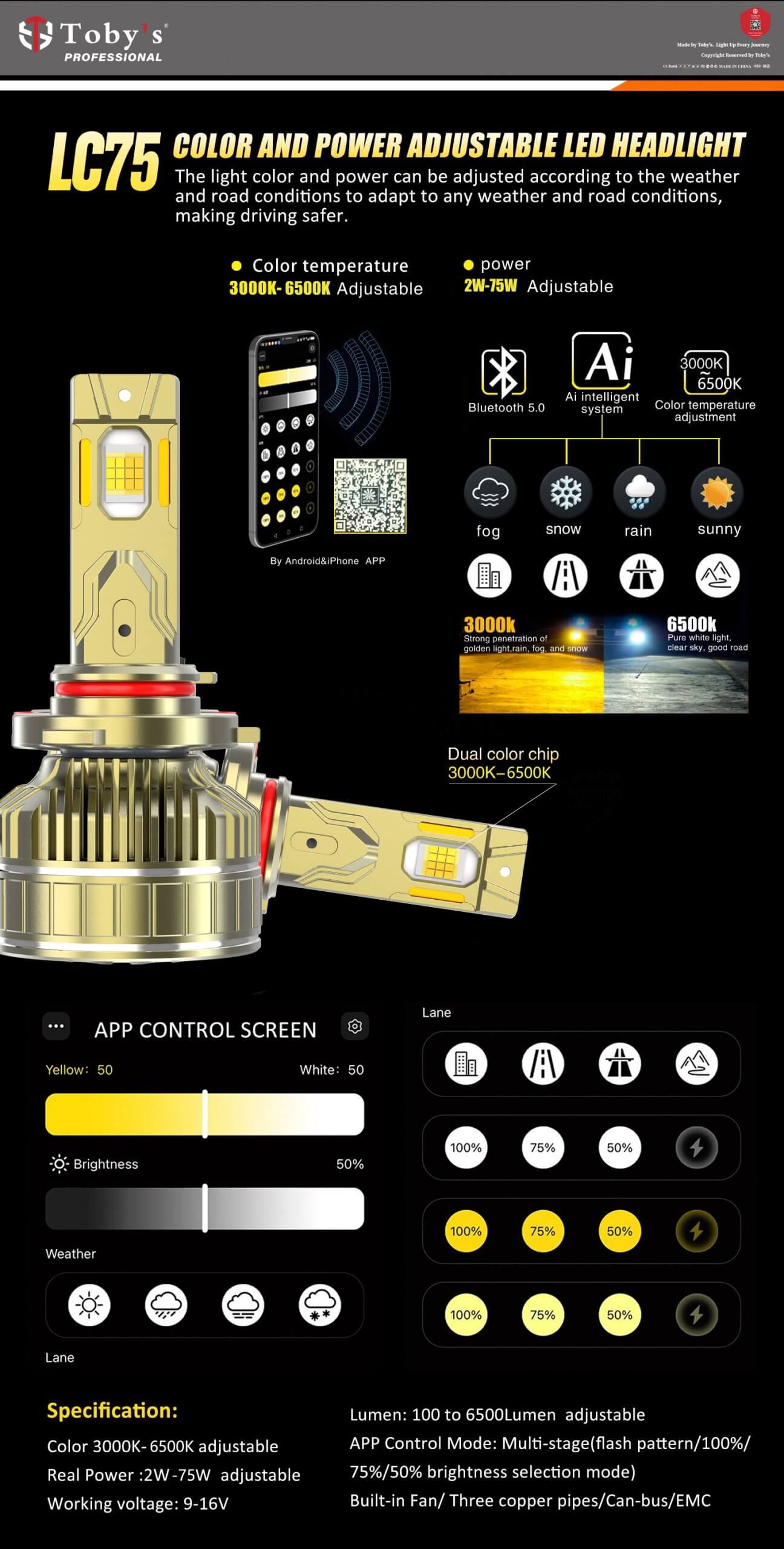 APP control only adjusts low beam color temperature; high beam remains white light at 6500K